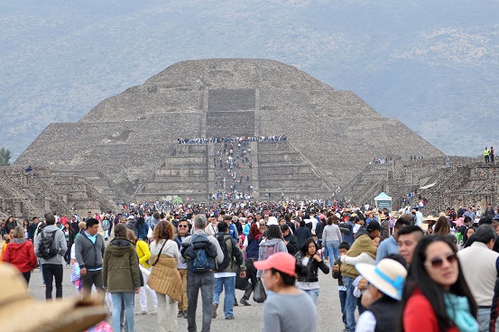Hombres, mujeres y niños iniciaron el recorrido para llegar a la Pirámide del Sol, acompañados por las plumas y el sonido de caracoles y huehuetls (tambores).