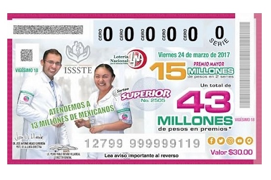 Con motivo del 57 aniversario del Instituto de Seguridad y Servicios Sociales de los Trabajadores del Estado (ISSSTE), la Lotería Nacional emitió un billete conmemorativo para el sorteo del próximo 24 de marzo.