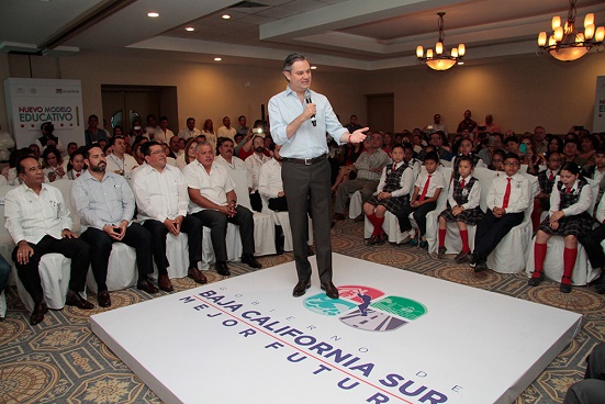Acompañado por el gobernador Carlos Mendoza Davis, a quien reconoció su compromiso con el sistema educativo, el secretario de Educación Pública presentó los ejes del Modelo, y explicó que con la creación de la Secretaria de Educación Pública se planteó que en cada rincón del país hubiera un maestro y una escuela, en un país con 15 millones de habitantes, de los que casi el 80 por ciento era analfabeta.
