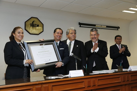 Por su notable gestión al frente de la Administración 2013-2017 de la Universidad Autónoma del Estado de México, la Federación de Asociaciones Autónomas de Personal Académico de la institución (FAAPAUAEM) entregó al rector Jorge Olvera García un reconocimiento, avalado por los integrantes del Comité Ejecutivo, los 48 presidentes de asociación y los más de siete mil afiliados a esta agrupación sindical.