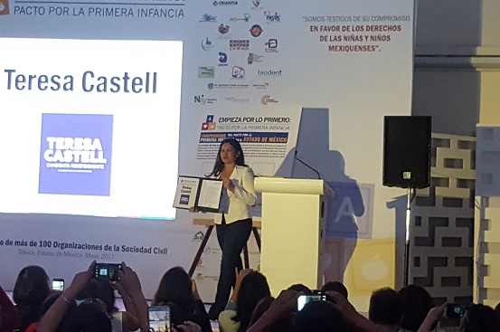 Toluca.- Al signar el Pacto por la Primera Infancia, que promueven más de 150 organizaciones de la sociedad civil, encabezadas por la asociación Un Kilo de Ayuda, la candidata independiente a la gubernatura del Estado de México, María Teresa Castell de Oro Palacios, anunció que, al obtener el triunfo el próximo 4 de junio, se crearán procuradurías para atender delitos en contra de infantes, a fin de evitar la violencia en contra de este sector de la población, además de que incrementará la infraestructura educativa para fortalecer las capacidades de los pequeños y brindarles mejores oportunidades de desarrollo.