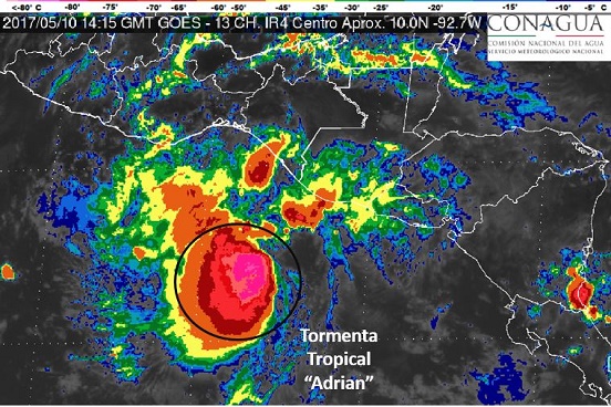 Con seis días de anticipación a la temporada oficial de ciclones tropicales del Océano Pacífico, se formó la primera tormenta tropical “Adrián”, la cual originará lluvias intensas en Oaxaca y Chiapas, informó el Servicio Meteorológico Nacional (SMN).