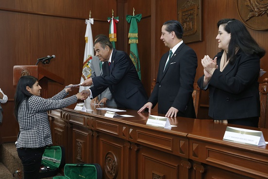 En la Sala “Dr. Gustavo Baz Prada” del Edificio de Rectoría, donde se entregaron 41 apoyos: 21 Becas de Titulación, 11 Becas Académicas de Gates, ocho Becas de Manutención “Lic. Adolfo López Mateos” y una Beca de Apoyo para Prácticas Profesionales, así como instrumentos musicales a integrantes de la Orquesta Sinfónica Juvenil de la institución, con un monto total cercano a los 243 mil pesos, Benítez Treviño reconoció “la extraordinaria labor realizada por Jorge Olvera García al frente de esta casa de estudios”.