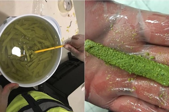 Ante las inconsistencias, los federales abrieron la caja de cartón y encontraron que en el interior de las cubetas había líquido aceitoso, que simulaba baba de nopal pero con un olor a compuesto químico.