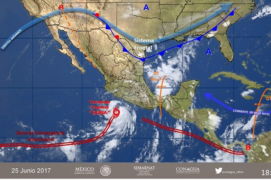 Lo anterior continuará siendo resultado de la tormenta tropical Dora, la cual se localizará al sur de las costas de Colima y Michoacán, además de la onda tropical 7, la cual se extenderá sobre el oriente de México.