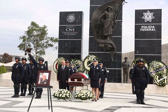 En la ceremonia de cuerpo presente del inspector José Rigoberto Peña Cárdenas, realizada frente al monumento al Policía Federal Caído, en el Centro de Mando de Iztapalapa, reiteró a familiares y amigos presentes, el apoyo y respaldo de la institución, la cual -dijo- los acompaña en su dolor.