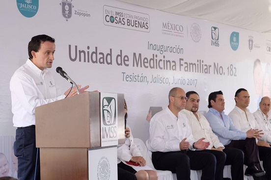 Al inaugurar la Unidad Médica Familiar número 182 del Instituto Mexicano del Seguro Social, el director general del IMSS, Mikel Arriola, y el gobernador Aristóteles Sandoval, resaltaron el aumento de derechohabientes en Jalisco.