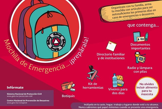La dependencia precisó en una infografía publicada en su cuenta de Twitter @PcSegob que es importante organizarse con la familia para armar este equipaje, mismo que debe incluirse en el auto, hogar, trabajo, y lugares donde esté al alcance, toda vez que nunca se sabe cuándo se presentará una urgencia.