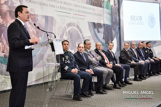 En presencia de representantes de la sociedad civil, de la Cruz Roja Mexicana, académicos, empresarios, de la secretarías de la Defensa Nacional y de Marina, y de la Policía Federal, el Secretario Osorio Chong indicó que gestionar y reducir los riesgos causados por los fenómenos naturales es una tarea que exige corresponsabilidad nacional e internacional, porque no solo se trata de mitigar pérdidas y evitar retrocesos sociales y económicos, sino cuidar y salvaguardar lo más valioso que tenemos como países: la vida y la integridad de las personas.