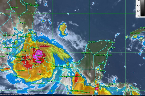 El fenómeno natural registra vientos sostenidos de 140 kilómetros por hora y rechas de 165 kilómetros por hora, y su desplazamiento es hacia el Oeste a 20 kilómetros por hora.