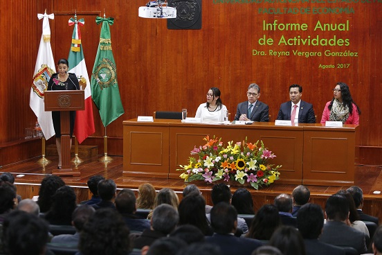 Al encabezar el Segundo Informe de Actividades de la directora de la Facultad de Economía, Reyna Vergara González, anunció que será un documento que permitirá a los universitarios en su conjunto, consolidar “la Universidad moderna que exige nuestro tiempo, la Universidad con visión para afrontar los dinámicos desafíos del planeta y con estrategia enfocada a los factores determinantes del cambio”.