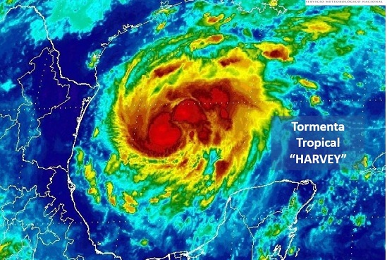 La tormenta tropical Harvey se mantiene en aguas del Golfo de México y se intensificará de manera paulatina mientras avanza hacia el nor-noroeste del país, con lluvias de fuertes a muy fuertes desde Campeche, Yucatán, Chiapas, Veracruz, Tabasco a Tamaulipas, informó el Servicio Meteorológico Nacional (SMN).