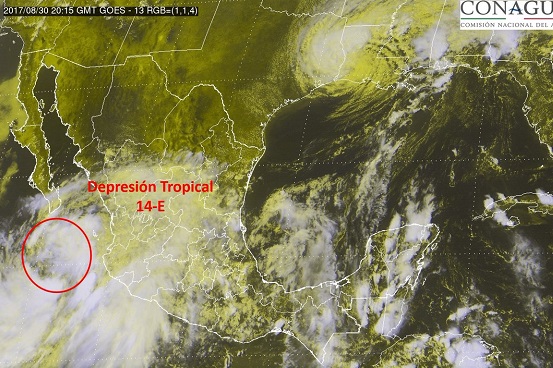 La depresión tropical 14-E en el Océano Pacífico, ocasiona potencial de lluvias, vientos fuertes y oleaje elevado sobre el occidente del país y Baja California Sur, reportó la Dirección Municipal de Protección Civil.