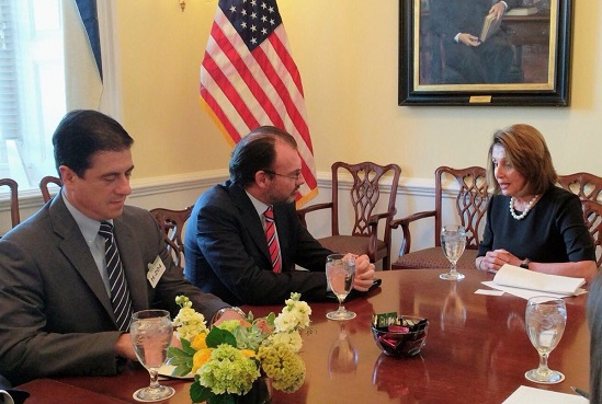 Por la tarde, el Canciller Videgaray y el Embajador Gutiérrez se reunieron con Nancy Pelosi, líder de los Demócratas en la Cámara de Representantes, con quien hablaron sobre la necesidad de una solución legislativa que dé certidumbre jurídica a los jóvenes DACA.