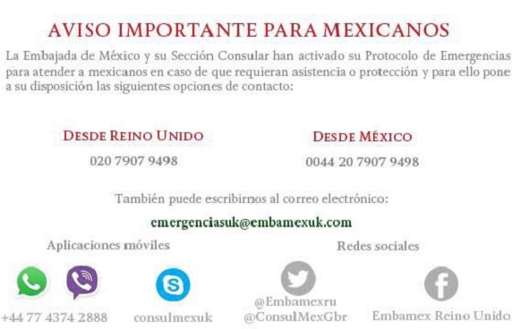 Desde Reino Unido el 020 7907 9498 y desde México el 044 20 7907 9498 o pueden escribir al correo electrónico emergenciasuk@embajmexuk.com.