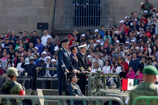Como establece el Reglamento del Ceremonial Militar, el presidente Enrique Peña Nieto, acompañado de los secretarios de la Defensa Nacional, Salvador Cienfuegos Zepeda, y de Marina, Vidal Francisco Soberón Sanz, inició los actos protocolarios del desfile, con el izamiento de bandera en el asta monumental de la Plaza de la Constitución.
