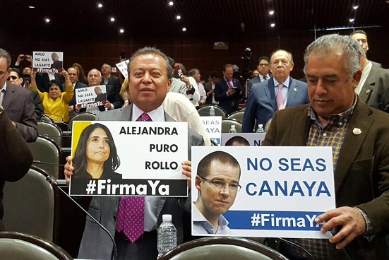 El político yucateco pidió a los legisladores retirar las pancartas de tribuna, mientras que el diputado de Morena, Cuitláhuac Garcia mostraba una contra el PRI y PAN a un costado del propio presidente de la Mesa Directiva.