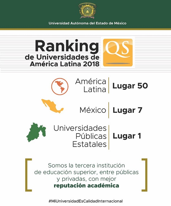 La Universidad Autónoma del Estado de México consiguió una histórica posición en el Ranking de Universidades de América Latina 2018 de QS -Quacquarelli Symonds-, donde por su calidad, se ubica en el lugar 50 de la región, como la séptima mejor del país –entre públicas y privadas-, la primera universidad pública estatal y la cuarta pública de México.