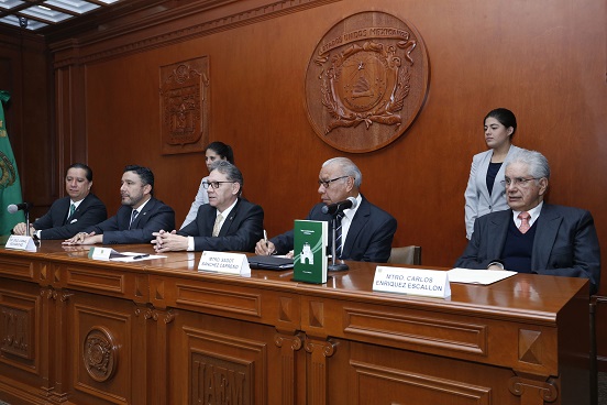 La presentación del libro estuvo encabezada por el rector de la UAEM, Alfredo Barrera Baca; el hijo del homenajeado, Carlos Enríquez Escallón; el director general del Centro de Estudios de Derecho e Investigaciones Parlamentarias de la Cámara de Diputados del Congreso de la Unión, Sadot Sánchez Carreño; así como el presidente de la Junta de Coordinación Política del Congreso mexiquense, Cruz Juvenal Roa Sánchez, y el titular de la Comisión de Derechos Humanos de la entidad, Jorge Olvera García.