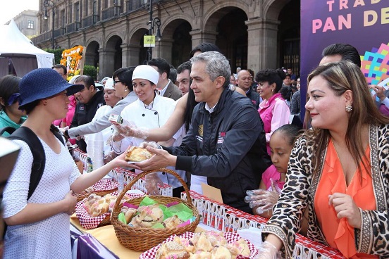 El jefe de Gobierno Miguel Ángel Mancera encabezó la entrega del tradicional pan de muerto en el Zócalo capitalino, donde se reunieron niños, jóvenes y adultos para degustar ese antojo tradicional.