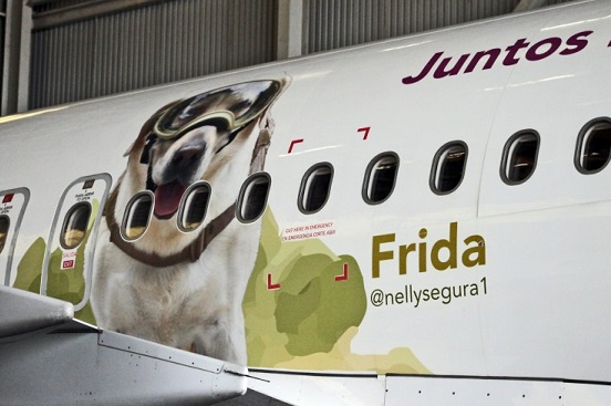 La línea aérea Volaris colocó una fotografía de la perrita rescatista Frida en uno de sus aviones como un homenaje a los brigadistas que participaron en las labores de rescate y reconstrucción tras los sismos que afectaron al país en septiembre pasado.