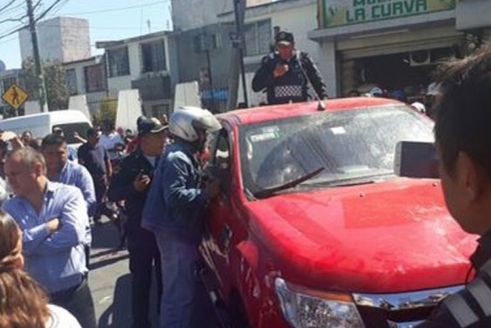 Elementos de la Secretaría de Seguridad Pública (SSP) de la Ciudad de México rescataron, en calidad de detenidos, a dos sujetos que quedaron atrapados dentro de su automóvil, luego de intentar atravesar un bloqueo y agredir a manifestantes en Avenida Centenario, delegación Álvaro Obregón.