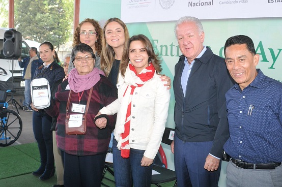 La directora general del Sistema Nacional para el Desarrollo Integral de la Familia (SNDIF), Laura Barrera Fortoul, entregó ayudas funcionales, como sillas de ruedas, andaderas, muletas, auxiliares auditivos y bastones, a población vulnerable de Metepec y Almoloya de Alquisiras.