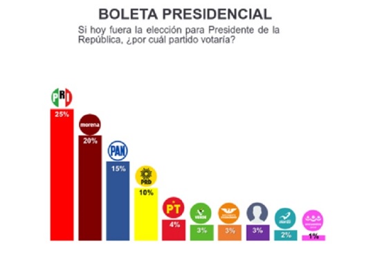 Preferencia electoral para la Presidencia: los encuestados respondieron que, si hoy fueran las elecciones para Presidente de la República, 25 por ciento votaría por el PRI, seguido de Morena con 20%.