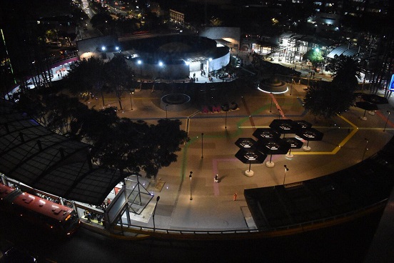 Para mejorar y modernizar la imagen urbana de la Glorieta de Insurgentes cuenta con 42 luminarias, dos fuentes bailarinas con una capacidad de 18 mil litros de agua y 14 cobertizos con iluminación y contactos eléctricos trifásicos y puertos USB.