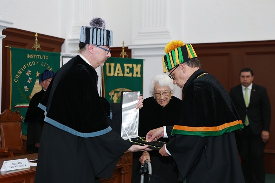 Dolores Castro, quien se describió como “una entusiasta del saber y una persona que ha creído en la transformación de los jóvenes a través de la educación universitaria”, afirmó que el Doctorado Honoris Causa de la UAEM es “luz en mi vida”.
