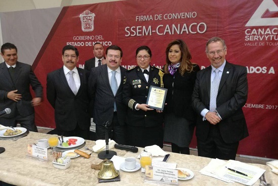 La secretaria de Seguridad del Estado de México, Maribel Cervantes Guerrero, firmó un convenio con la presidenta de la Cámara Nacional de Comercio, Servicios y Turismo (Canaco-Servytur) del Valle de Toluca, Laura González Hernández, para combatir la delincuencia de manera integral.