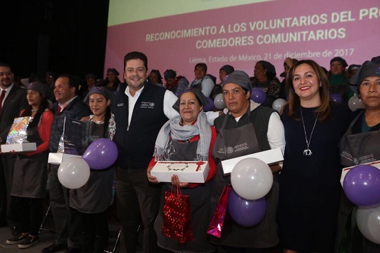 Durante el acto, el funcionario reconoció el esfuerzo y dedicación de más de 20 mil voluntarias mexiquenses que hacen posible el funcionamiento de los dos mil comedores en la entidad, donde 180 mil personas desayunan y comen diariamente.
