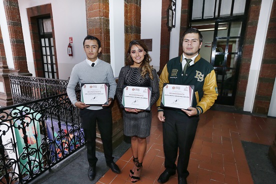 Claudia Paola Galindo Villarreal, Axel Eloir Santos Mancilla y Jesús Alberto HernándezBaylón, estudiantes de la Universidad Autónoma del Estado de México, fueron reconocidos por el ayuntamiento de Toluca con el Premio Municipal del Deporte 2017.