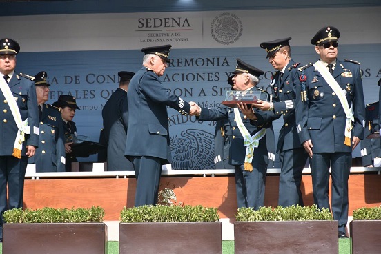El titular de la Secretaría de la Defensa Nacional, Salvador Cienfuegos Zepeda, encabezó hoy la ceremonia de entrega de condecoraciones y reconocimientos a los Generales del Ejército y la Fuerza Aérea Mexicanos que pasaron a situación de retiro.