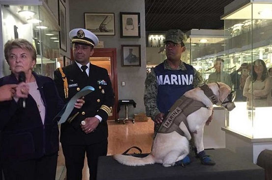 La Secretaría de Marina Armada de México (Semar) también entregó a este recinto, único en su tipo en Latinoamérica, las botas de Israel Arauz Salinas, manejador que ha acampañado a la perrita en más de tres años.