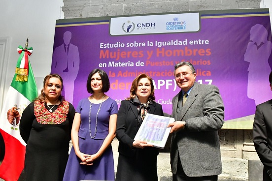En la presentación del “Estudio sobre la igualdad entre mujeres y hombres en materia de puestos y salarios en la Administración Pública Federal 2017”, por la Comisión Nacional de los Derechos Humanos (CNDH), señaló que debe acelerarse el ritmo de los esfuerzos para lograr la igualdad salarial y laboral entre mujeres y hombres.