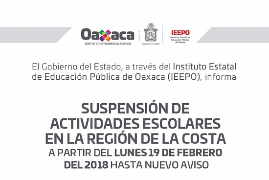 El Instituto Estatal de Educación Pública de Oaxaca (IEEPO) informó que el gobierno estatal instruyó la suspensión de clases en las escuelas de nivel básico en la región de la Costa, para continuar el censo y evaluación de los inmuebles educativos afectados.