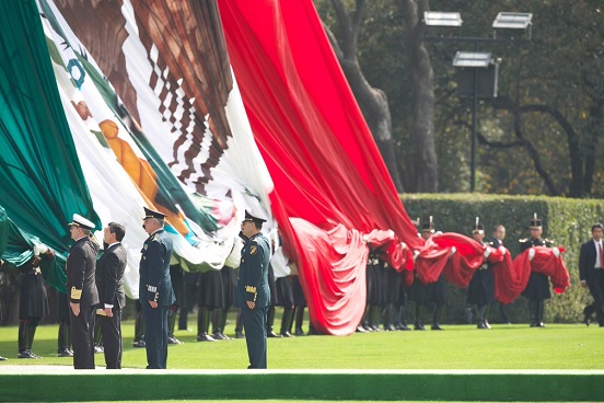 Al respecto, el presidente Peña Nieto publicó, con el la mencionada etiqueta, una fotografía en la que se observa una bandera monumental ante el cual el mandatario federal muestra su respeto, acompañado por los secretarios de la Defensa, Salvador Cienfuegos Zepeda, y de la Marina, Vidal Francisco Soberón Sanz.