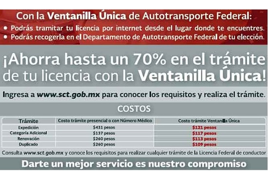 Durante 2017 se tramitaron 50 mil licencias a través de la Ventanilla Única Electrónica, implementada por la Secretaría de Comunicaciones y Transportes (SCT), con el objetivo de dar transparencia y rapidez a los trámites para la expedición, renovación o reposición de licencias, matrículas y registro de permisos para los usuarios del autotransporte federal.