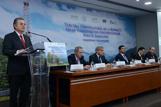 El Gobierno de la República presentó hoy la convocatoria para licitar la Ronda 3.3 de recursos no convencionales, que incluye 9 bloques en la Cuenca de Burgos, en el norte de Tamaulipas. Al respecto, el Secretario de Energía, Licenciado Pedro Joaquín Coldwell, dijo que la Reforma Energética permite emplear nuevas herramientas para aprovechar los recursos petroleros y gasíferos que se encuentran en depósitos poco explorados en el país. Por ello, el desarrollo de este proyecto es trascendental para la industria de hidrocarburos mexicana, que reactivará la economía de regiones cuya actividad se vio disminuida con la caída de los precios del petróleo.