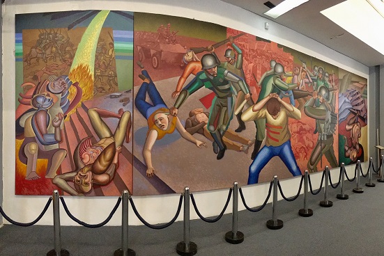 Asimismo, realizó una serie de murales que llamó “Batallas históricas” y en algunas de sus obras correspondientes a esta serie incluyó elementos que hacen referencia a lo sucedido en la batalla de Tlatelolco, lo cual hace que sus murales mantengan un diálogo diacrónico.