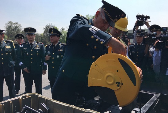 Acompañado del notario 102 del Estado de México, Horacio Aguilera, quien dio fe de esa destrucción de armamento, el secretario de la Defensa, Salvador Cienfuegos presenció la forma en que se clasifican, desarman, destruyen, embalan y reciclan las armas decomisadas a grupos criminales en el país.