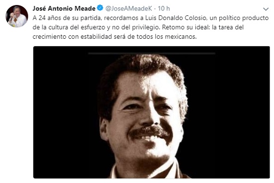 “A 24 años de su partida, recordamos a Luis Donaldo Colosio, un político producto de la cultura del esfuerzo y no del privilegio. Retomo su ideal: la tarea del crecimiento con estabilidad será de todos los mexicanos”, publicó en su cuenta @JoseAMeadeK de Twitter.