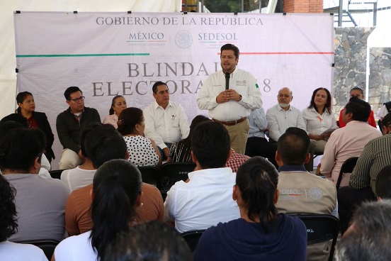 Por la mañana, García Bejos encabezó en Cuernavaca, Morelos, la capacitación a servidores públicos de la Sedesol sobre el Programa de Blindaje Electoral. En ese marco, destacó que entre 2013 y 2017, la administración del Presidente Peña Nieto invirtió alrededor de 12 mil millones de pesos a través de la dependencia en territorio morelense.