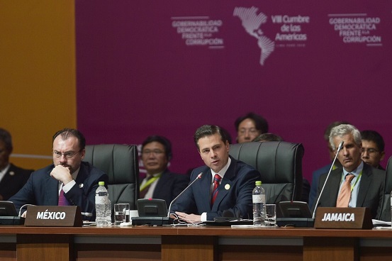 Durante su intervención en la sesión plenaria de la VIII Cumbre de las Américas apuntó que “con respecto a los acontecimientos de ayer por la noche en Siria, México reitera su más amplia condena al uso de las armas químicas”.