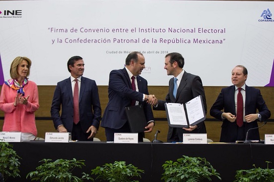 Al resaltar la confianza del sector empresarial hacia el Instituto Nacional Electoral (INE), así como en su fortaleza y autonomía, la Confederación Patronal de la República Mexicana (Coparmex) firmó dos convenios con ese organismo autónomo, para impulsar la democracia participativa.