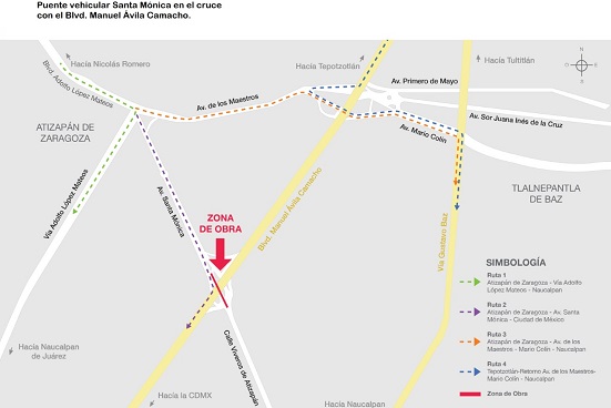 La Junta de Caminos del Estado de México definió las rutas alternas que serán implementadas ante los trabajos de rehabilitación integral del puente vehicular Santa Mónica.