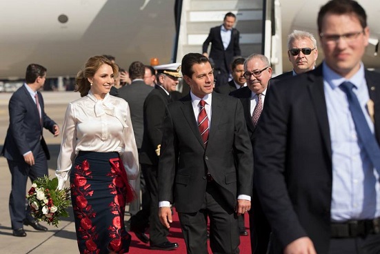 Peña Nieto viaja acompañado por su esposa, Angélica Rivera de Peña, y los secretarios de Economía, Ildefonso Guajardo Villarreal; de Relaciones Exteriores, Luis Videgaray Caso, y el vocero del gobierno federal, Eduardo Sánchez.