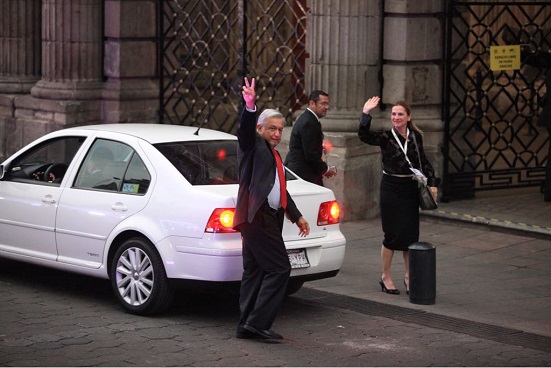Ataviado con un traje color negro y corbata roja, López Obrador descendió del vehículo y levantó el brazo como un gesto de saludo a los representantes de los medios de comunicación.