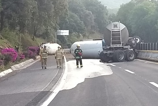 De acuerdo con Caminos y Puentes Federales de Ingresos y Servicios Conexos (Capufe), los servicios de emergencia siguen laborando para atender el accidente de la unidad, debido a que presenta una fuga del combustible que transporta.